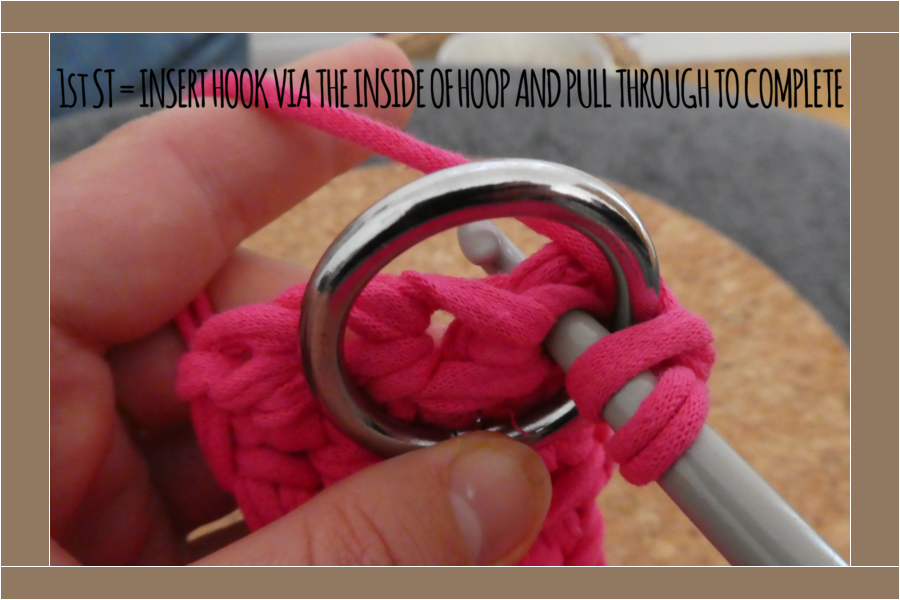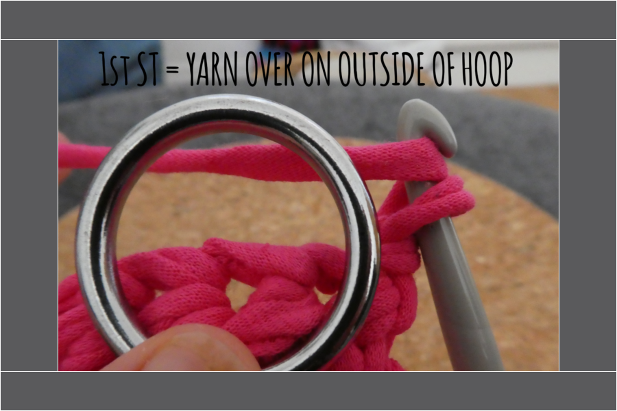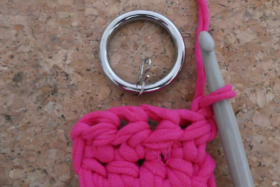 Lastly, if you have made the bag via a hoop, attach the T-shirt yarn to the hoop and work (X4HTR +1CH, turn) X (the desired length) approx. 50 rows, attaching to the other side of the bag to complete.