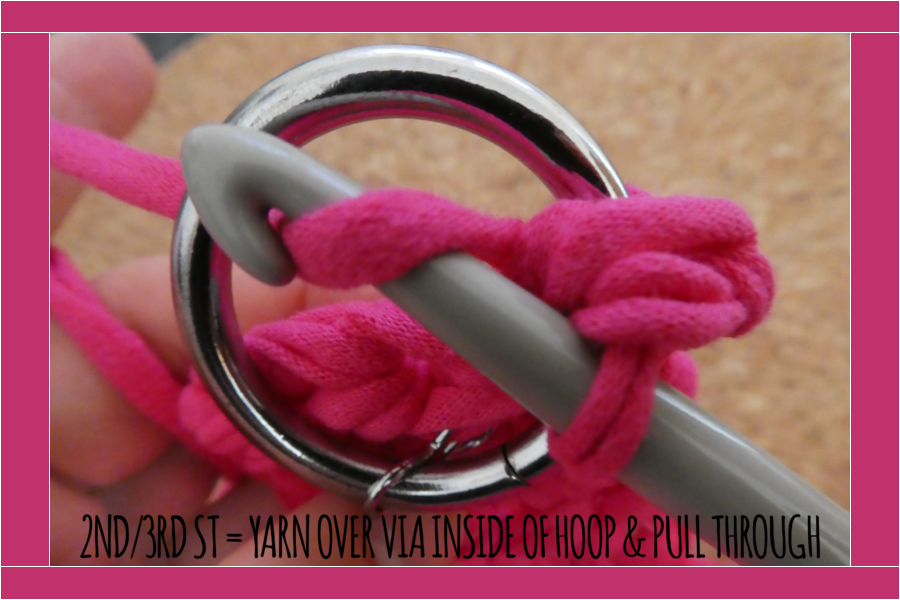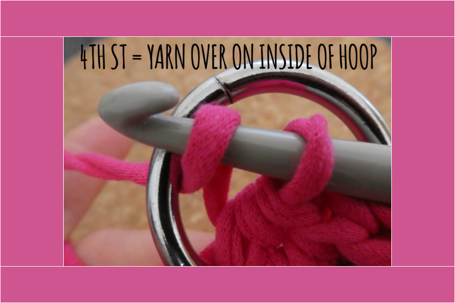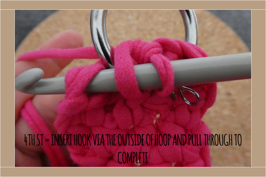 To attach the hoops, we will work the 1st and 4th stitch around the outside of the hoop, and then the 2nd and 3rd stitch will be worked inside the hoop.
