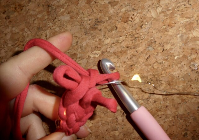 Using some Hooked Zpagetti yarn and a size 9mm hook make one long iCord about 1m long. As you work the iCord slide the battery operated lights in the middle and continue crocheting around them.